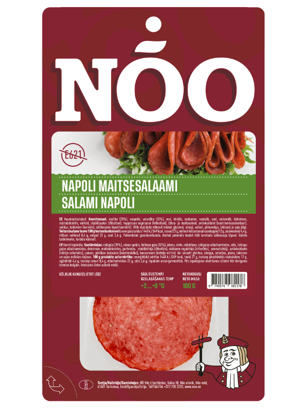 pork (87%), lard, water, starch, salt, stabilizer E450, acidity regulator E451, antioxidants E300, E316, spices, herbs (including chili 0.7%), tomato powder, flavorings, dextrose, food coloring E120, preservative E250. May contain small amounts of milk protein, lactose and traces of mustard.